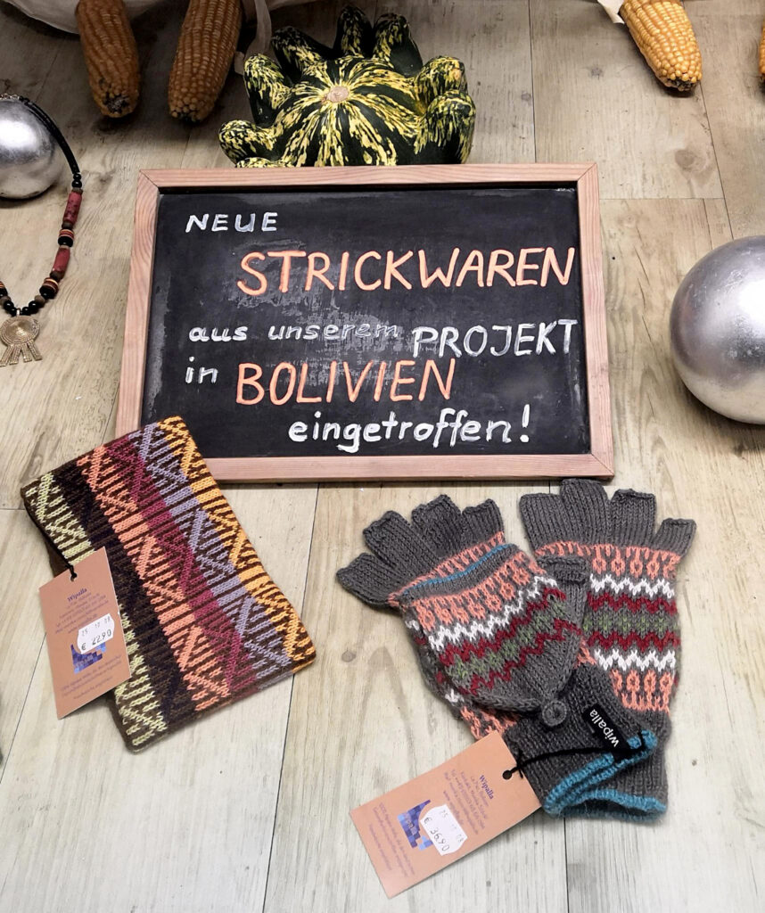 Wir haben eine große Auswahl an farbenfrohen Handschuhen, Stulpen und Stirnbändern mit aufwändigen traditionellen Mustern. Auch größere Teile wie Pullover, Jacken und Capes sind in unseren Weltläden in Rosenheim und Brannenburg erhältlich.